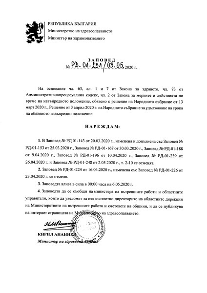 От 00:00 часа на 6 май преустановяват дейността си контролно-пропускателните пунктове, организирани от Министерството на вътрешните работи, на входно-изходните пътища на областните центрове. Това нарежда министърът на здравеопазването със своя заповед, издадена днес.