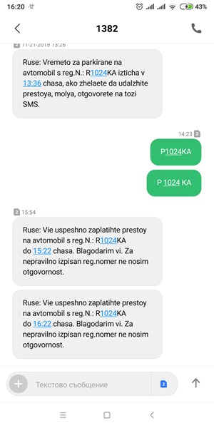 Днес към 14 часа си платих с sms за паркиране в центъра на Русе, не получих потвърждение, пуснах втори sms, който се сещате не е безплатен и чак в 16 часа получавам sms, че плащането ми е успешно.