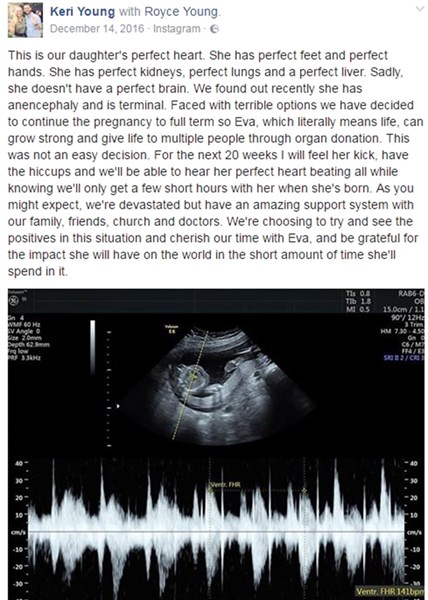 „Нашата дъщеря има перфектно сърце, перфектни крака и перфектни ръце. Тя има перфектни бъбреци, перфектни дробове и перфектен дроб. Тя обаче няма перфектен мозък, защото страда от аненцефалия. Аз и мъжът ми решихме да родя моята Ева. Името й значи живот. Искам чрез нея да даря живот на много хора, които се нуждаят от органи”, пише Кери в социалната мрежа, след като разбира тежката новина.