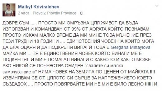 „Добре съм, просто ми омръзна цял живот да бъда използван и командван от 99% от хората, които познавам. Просто искам малко повече време да ми мине това мъчение през тези трудни 18 години. Единственият човек, на който мога да благодаря и да подкрепя винаги, това е Гергана Михайлова, майка ми. Тя е единственият човек, който винаги ме е подкрепял и помагал винаги с каквото и както може. Ако някой се почувства обиден, "свалете си малко самочувствието". Няма човек на земята по-ценен от майката!!! Извинявам се от цялото си сърце за напрежението, което създадох. Просто, повярвайте ми, не ми е било лесно!!!!!”.