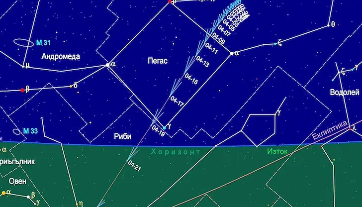 "В утрата около 19 април теоретично трябва да можем да забележим кометата с невъоръжено око, но с бинокъл ще я открием в небето много по-бързо", допълни Пенчо Маркишки. На тази дата кометата ще изгрее около 04:47 часа и ще може да бъде локализирана в съзвездието Риби. Най-близо до Земята тя ще се окаже на 26 април, но тогава няма да е видима заради голямата си близост до слънчевия диск.