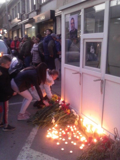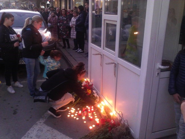 Близо 1000 жители на Кюстендил преминаха мълчаливо шествие от площада до лобното място на убития в неделя Валери Дъбов, където положиха цветя и запалени свещи на земята.