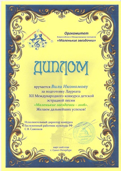 Признание и отличие получи и нейният вокален педагог маестро Вили Икономов. Към наградите си той прибави и Диплом за подготовката и представянето на младият талант в конкурса.