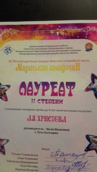 5-годишната Ая Христова, възпитаничка на вокално студио за поп и джаз „Икономов“ в Русе, се завърна с две награди от XIІ-я международен конкурс за детска естрадна песен „Малки звездички“, който се проведе от 20 до 25 март 2016 г. в Санкт Петербург, Русия.