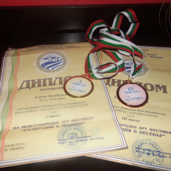 С две награди се завърна Елица Камбурова от Детска вокална група „Слънце”, с ръководител Наталия Константинова при Общински детски център за култура и изкуство, от VI Международен арт-фестивал "Съзвездия в Несебър".