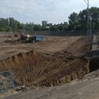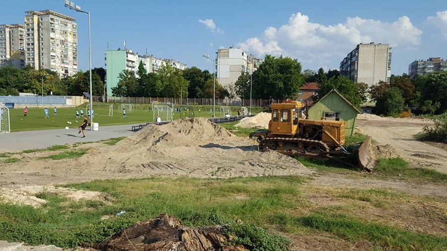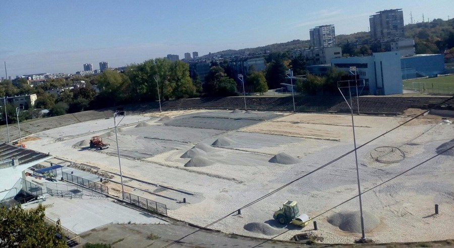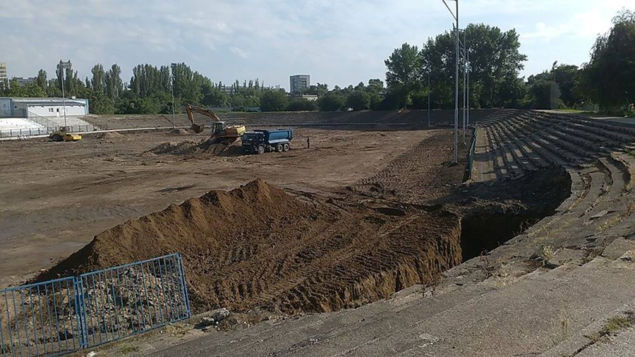 От фотосите се вижда, че на стадион „Дунав“ работят багери, фадроми, валяци, камиони, лее се бетон, полага се нова тревна настилка, изграждат се две изкуствени футболни игрища зад всяка една от футболните врати.
