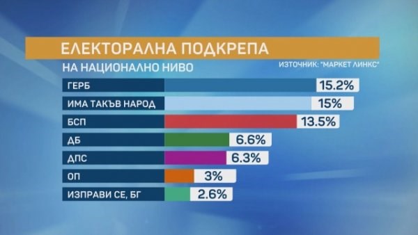 "Маркет Линкс": Подкрепата за ГЕРБ и "Има такъв народ" е еднаква