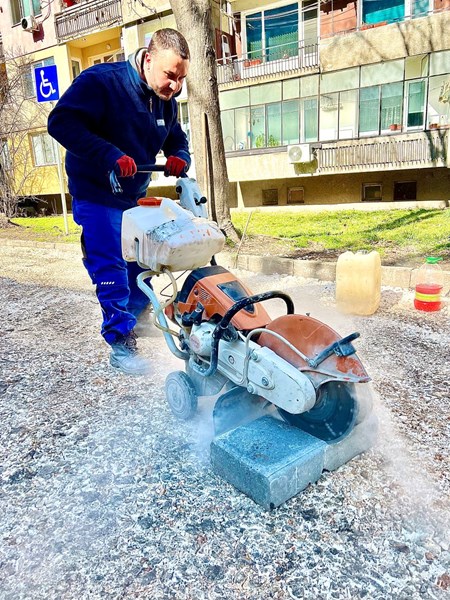 Продължават строителните работи по ремонт и подготовка за полагане на нова асфалтова настилка на подхода, пешеходната алея и паркинга към блок „81" в квартал „Здравец".