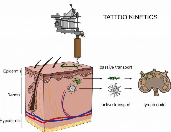 Пигментите, които съдържат мастилата и тушовете за татуиране, остават за дълго в лимфните възли, а понякога и за цял живот.
