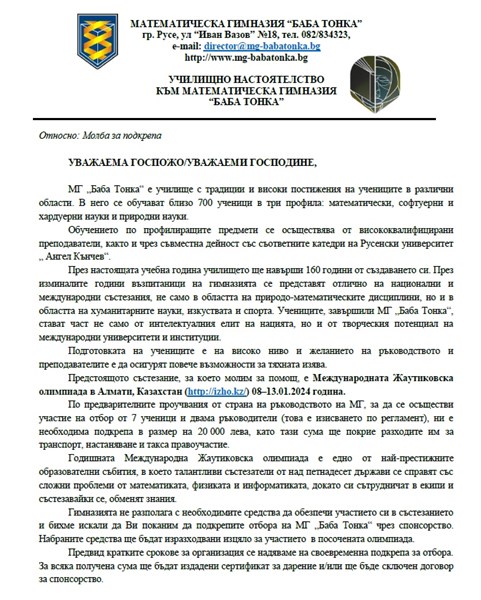Необходима е помощ за участие на отбора на МГ в Международната Жаутиковска олимпиада 2024 в Алмати, Казахстан (International Zhautykov Olympiad). Това е едно от най-престижните образователни събития, в което талантливи състезатели от над петнадесет държави се справят със сложни проблеми по математика, физика и информатика, докато си сътрудничат в екипи и състезавайки се, обменят знания.