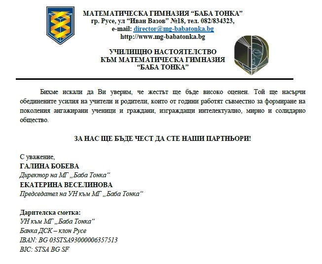 Подробности и дарителска сметка ще намерите в писмото от училищното ръководство и училищното настоятелство.