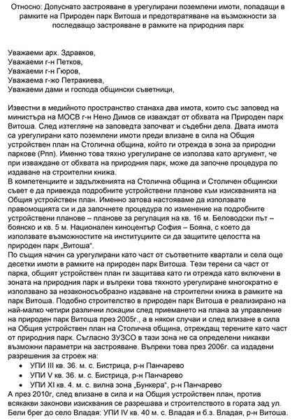 Два от имотите са известни - около тях тече скандал от две години, тъй като екоминистърът Нено Димов издаде заповед да бъдат изключени от обхвата на парка, става ясно от сигнала. Това решение е без прецедент - за пръв път в историята на парка се намалява територията му. "Направихме обстойна проверка на двата имота, които със заповед на Димов се изключват от парка. Те са урегулирани от общината, което е задължителна процедура преди застрояване. За по-големия от тях има интересен факт: става по времето на г-н Борисов като кмет. Но това не са единствените такива имоти. Около 150 терена в природния парк са със същия статут. От 2005 г. насам, след приемането на Плана за управление на парка, са застроени 4 имота. Един от тях получава разрешение дори след влизането в сила на Общия устройствен план на София, което за нас е безпардонна корупция", съобщава Манолова в профила си във "Фейсбук".