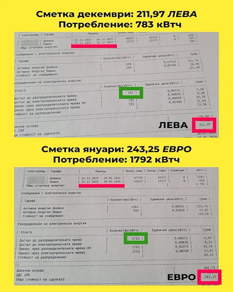 Потребители сигнализират за шокиращо увеличение на сметките за електроенергия през януари, като в някои случаи сумите нарастват с над 100% спрямо предходния месец. Лидерът на гражданската платформа "Изправи се.БГ" Мая Манолова публикува данни за домакинство, чиято сметка е скочила от 176 лева през декември до 202 евро (приблизително 395 лева) през януари.