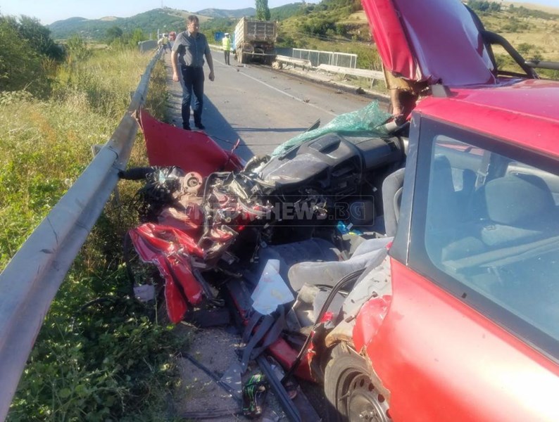 По данни на очевидци, лекият автомобил отскача от неравност на пътя, шофьорът не успява да овладее колата и се врязва челно в камиона, предаде MediaNews.bg.