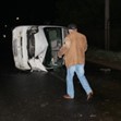 Водачът губи управление, блъска се в ограда и къща край пътя, след което се преобръща на пътното платно.