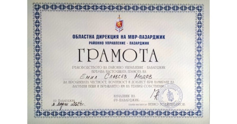 По-късно портфейлът е предаден на неговия собственик. За своята достойна постъпка, проявена честност и почтеност началникът на Районното управление на МВР в Пазарджик главен инспектор Ненко Годжевъргов изпрати благодарствена грамота във фирмата, в която работи г-н Медов със седалище в гр.Смолян. Там тя ще му бъде връчена лично.