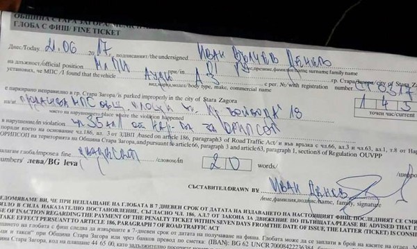 Според издалия документа Иван Вълчев собственикът на возилото е в нарушение на чл. 35 ал.1 от Наредбата за обществения ред за използването на превозни средства и общи площи.
