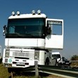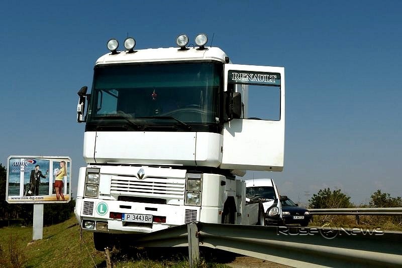 Ударът е бил доста силен, тъй като в резултат ТИР-ът излязъл вдясно по посоката на движението, предницата му се прехвърлила над мантинелата и увиснала над крайпътния скат.