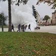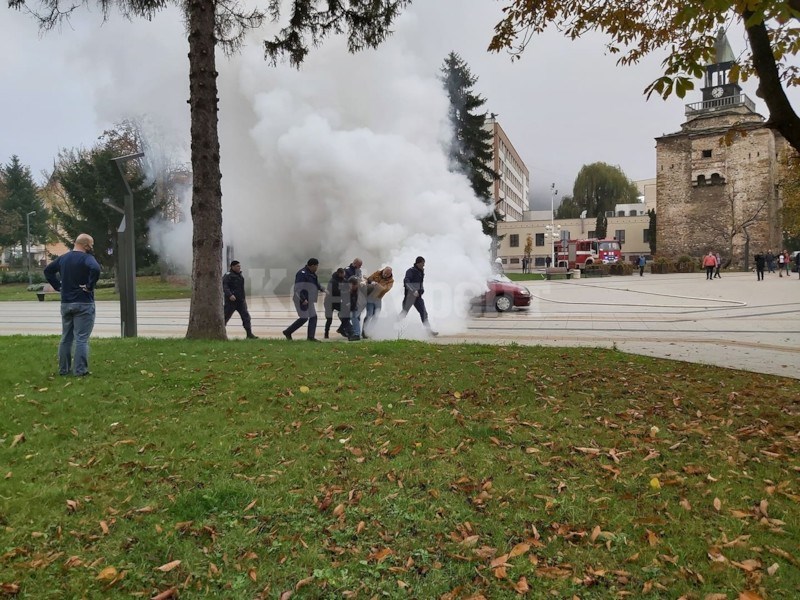 Изгорелият автомобил е пред общината и екип криминалисти започват работа сега на местопроизшествието. Мъжът е отведен в Районното управление на МВР и работата по случая продължа.