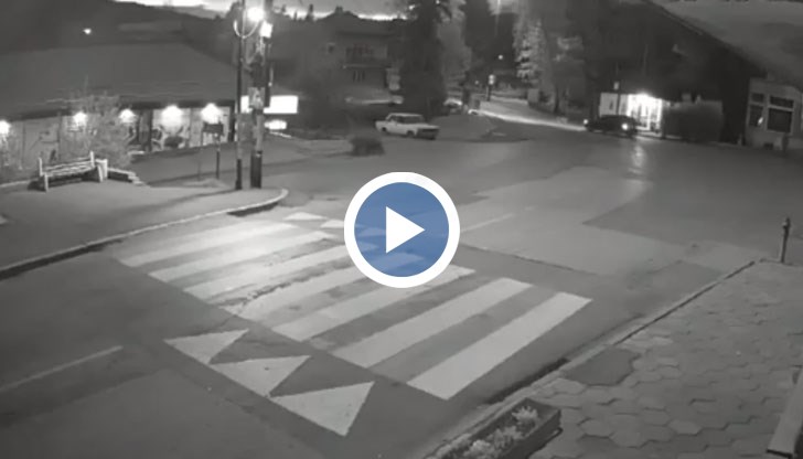 На втори записи мечката притичва по улица пред погледа на двама мъже, които стоят на тротоара.