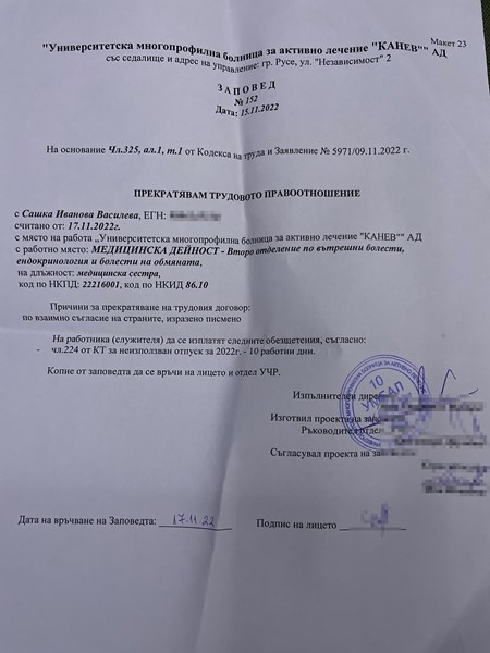 Когато отидох при главната мед. Сестра, за да ѝ обясня за тези случаи, тя ми обърна гръб и ми каза „не ме занимавай с твоите глупости“ и затова си позволих да потърся вас. Като ѝ казах, че всички тези думи ще ги кажа извън болницата, пред телевизия и социални медии, тя ми повиши тон и каза „коя си ти да ме заплашваш“. Аз пак ѝ отвърнах: какъв е този началник, той не мисли за бъдещето на отделението. Там са останали само сестри в пенсионна възраст, просто въпрос на време е те да напуснат, защото са възрастни. Вместо да остават да работят млади кадри като мен, те ги гонят. Насила ме накараха да напиша заявлението си. В противен случай нямаше да ми бъдат изплатени заплатите. Аз не исках да напусна и не исках да стигам до тук, но те ме принудиха, защото никой не пожела да чуе моята гледна точка.