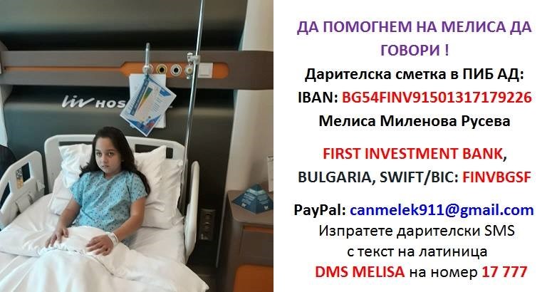 Всички събрани до момента средства в Хелпкарма и ДМС бяха преведени по дарителската й сметка. За съжаление набраната сума не бе достатъчна и се наложи родителите й да вземат заем, за да могат да покрият стойността на процедурата. Но нямаше как да се прекъсне процеса на лечението. От сърце се надяваме скоро да чуем първите цели думи на Мелиса.