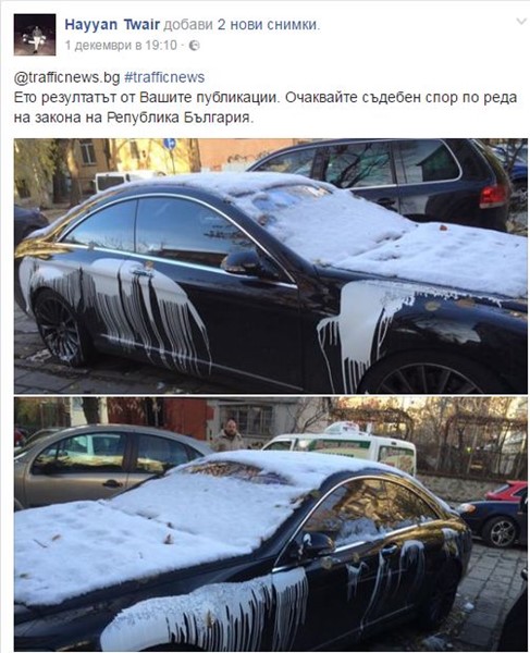 След като като е намерил мерцедеса си, залят с боя, Туаир отново е насочил вниманието си към Traffic News като е качил снимки на автомобила си със следния текст