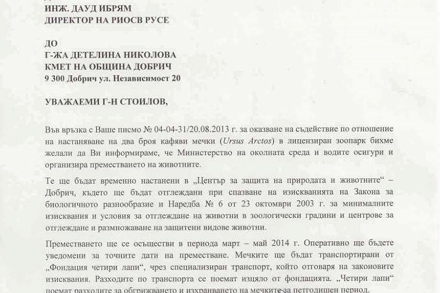 Министерство на околната и водите връща писмо до кмета /с дата 20.02.2014 г./, в което пише, че мечките ще бъдат транспортирани в Добрич в периода март - май 2014 г.