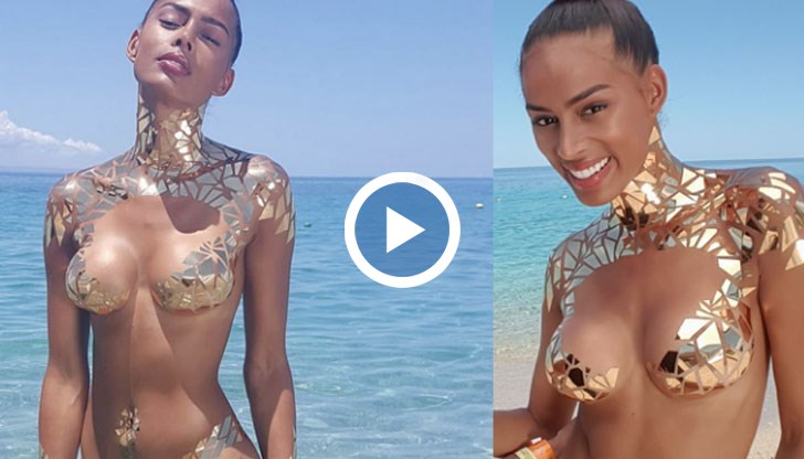 Металните пластини покриват шията, раменете и върха на гърдите на модела, а в долната си част са още по-оскъдни. Всъщност демонстрацията на металния бански се оказва не провокация към потребителите на Instagram, а проект на модна къща Black Tape Project.