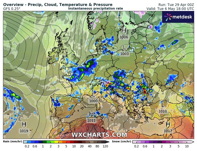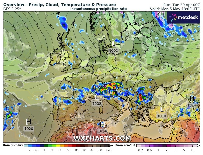 Серия от мощни гръмотевични бури ще преминат през страната ни в началото на май, предупреждават от Meteo Balkans. Синоптиците очакват значителни валежи, които могат да предизвикат наводнения в много градове в България.
