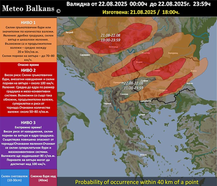 Meteo Balkans призовава гражданите да следят внимателно развитието на метеорологичната обстановка и да вземат предпазни мерки при очакваните екстремни явления.