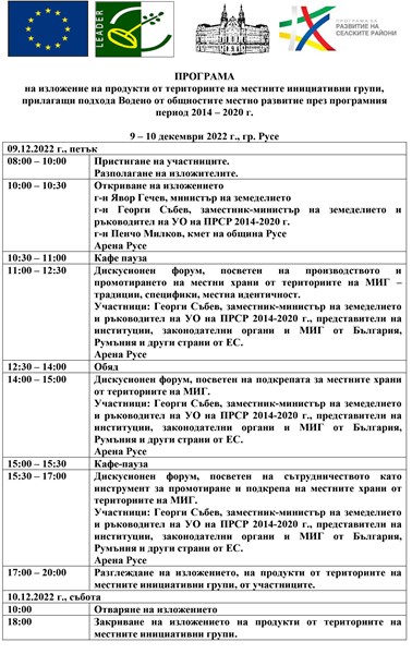 Министерството на земеделието (МЗм) организира международно изложение на местни продукти в зала „Арена Русе“ на 9 и 10 декември със съдействието на Община Русе. На форума ще бъдат представени продукти, произведени на териториите на Местните инициативни групи, финансирани по подхода „Водено от общностите местно развитие“ от Програмата за развитие на селските райони 2014-2020 г. Събитието ще бъде съпроводено с тематичен дискусионен форум с чуждестранно участие.