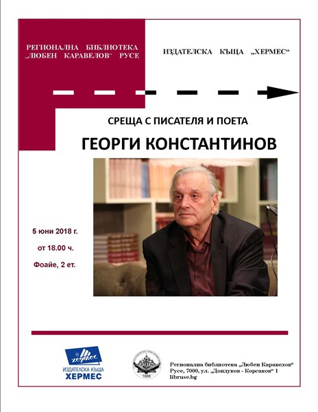 На 5 юни гост в Регионална библиотека „Любен Каравелов“ ще бъде един от най-обичаните поети на родната ни литература Георги Константинов. Ще се състои русенската премиера на най-новата му стихосбирка „Миг като вечност“, издателство „Хермес“.
