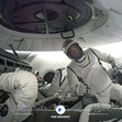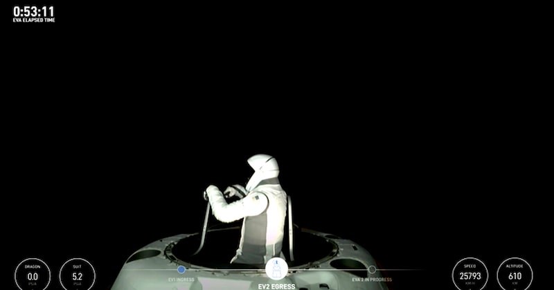 Прякото излъчване от борда на капсулата показа как Айзъкман, облечен в нов, бял скафандър, излиза през люка и се захваща за металната рамка, наподобяваща проходилка. Тази конструкция е част от капсулата и осигурява допълнителна стабилност при излизането. В същото време трима други членове на екипажа оставаха на борда, наблюдавайки действията му. Те също бяха оборудвани с новите скафандри, създадени да ги предпазят от суровите условия на космическия вакуум.