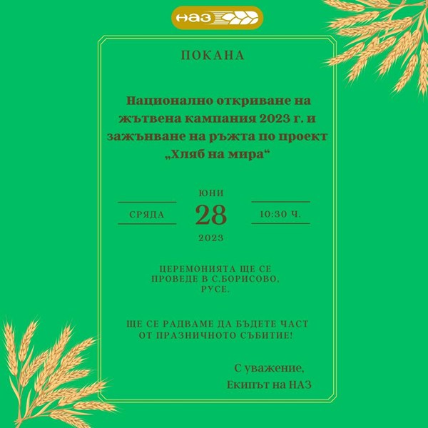 Национално откриване на жътвена кампания 2023 г. и зажънване на ръжта по проект „Хляб на мира“ ще се проведе на 28 юни 2023 г., съобщиха от Националната асоциация на зърнопроизводителите.