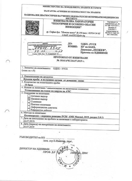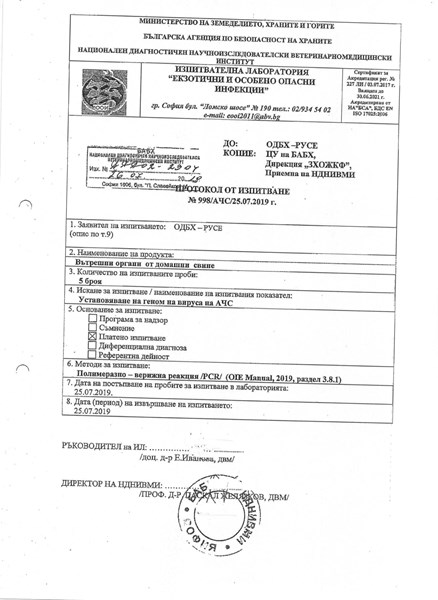 В следствие на техен избор, собствениците на свинекомплекса са избрали да изпратят пробата в НДНИВМИ, като същата е дала положителен резултат. След което собствениците са уведомили БАБХ и от своя страна агенцията е взела незабавно мерки като е извършила отново пробовземане , което е изпратила в държавната лаборатория. Резултатите категорично потвърждават наличие на вируса в свинекомплекса в Голямо Враново. Съгласно резултатите на 26.07.2019 г. със заповед на изпълнителния директор на Българска агенция по безопасност нахраните (БАБХ) е обявено огнище на заболяването в свинекомплекса. Определени са мерките за ограничаване и ликвидиране на констатираното огнище на АЧС, съгласно действащото национално и европейско законодателство.