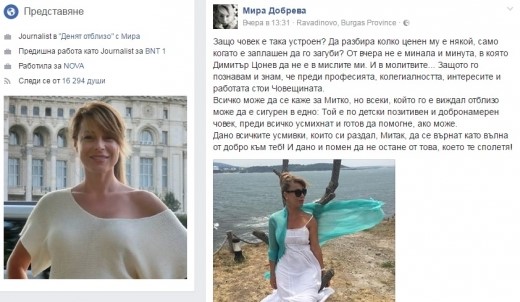 Журналистката е на почивка в Равадиново, но веднага се включи в личната си фейсбук страница, където написа: "Защо човек е така устроен? Да разбира колко ценен му е някой, само когато е заплашен да го загуби? Не е минала и минута, в която Димитър Цонев да не е в мислите ми. И в молитвите...