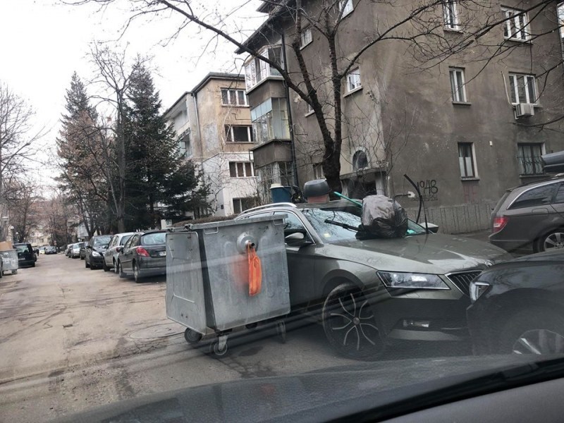 Недоволните жители на близките входове са вдигнали чистачките и са струпали торби с боклук върху шкодата, а накрая са заклещили колата с контейнера за смет. Това става ясно от публикувана снимка във фейсбук групата „Забелязано в София”.