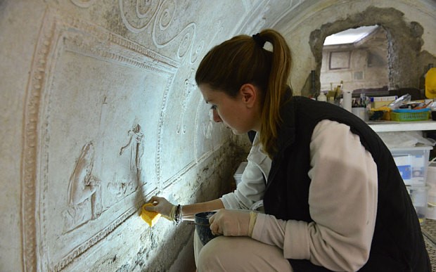 Екип от експерти все още реставрира вътрешността й, като внимателно премахва наслоената пръст и калциевите отлагания. За целта се използват химикали, специализирани инструменти и лазери.