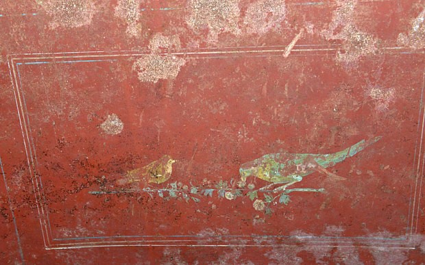 Главата на Медуза пази входа към залата, а долните части на стените са боядисани в кърваво червено, с интерпретации на птици и жени в тоги.