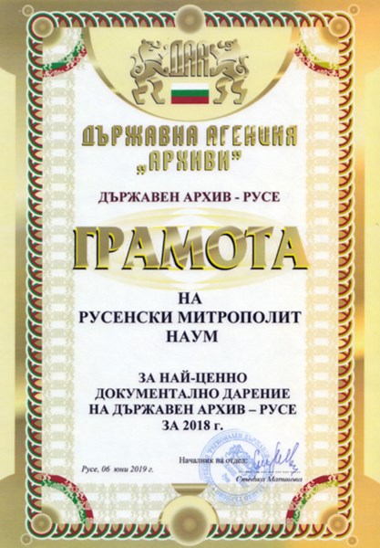 Във връзка с отбелязването на международния ден на архивите – 9 юни и в знак на внимание и благодарност на Негово Високопреосвещенство Русенския митрополит Наум беше връчена Грамота за „Най-ценно документално дарение на Държавен архив – Русе за 2018 г.”.