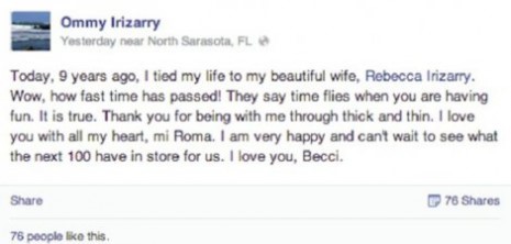 Само няколко часа след като във Facebook оставил любовно съобщение на съпругата си по повод годишнина от брака им, американският сержант Оми Иризари трагично загубил живота си, защото на плажа във Флорида го покосил малък частен самолет, който се приземил аварийно на плажа.