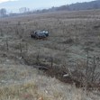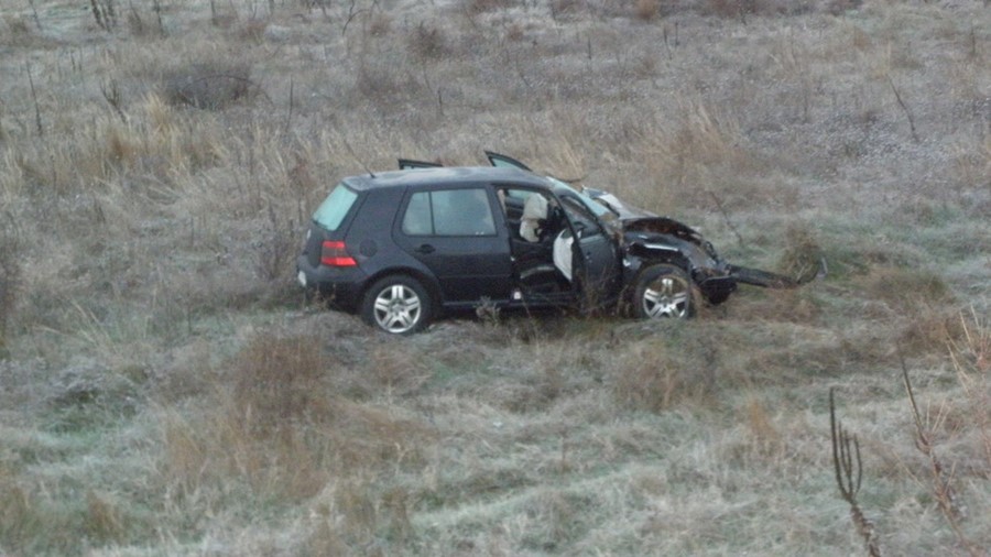 След като излита като от трамплин от огъналата се желязна ограда, колата лети близо 15 м. приземява се върху ската край пътя, след още един отскок се преобръща и спира в нивите върху колелата си.