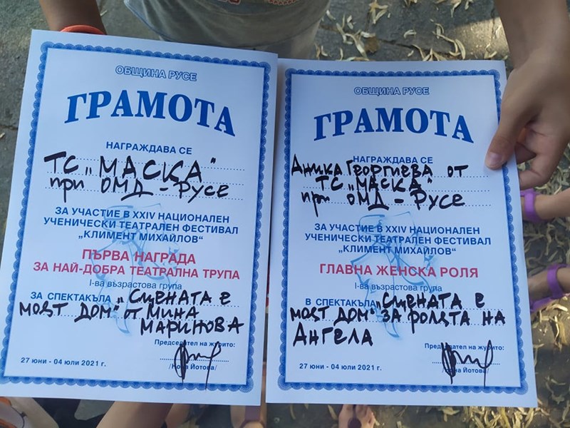 Общо 6 награди от два национални театрални фестивала спечели Театрално студио „Маска“ към Общински младежки дом – Русе със спектакъла „Сцената е моят дом – театрални упражнения“.