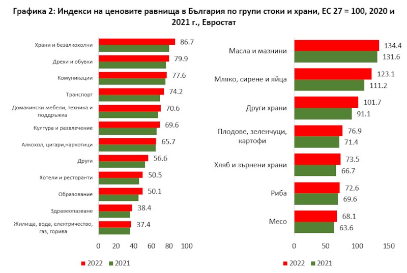 От по-голямо значение е обаче разпределението между отделните групи стоки и услуги, тъй като те имат и различна тежест в разходите на домакинствата. Така например докато при разходите за жилища и режийни, както при здравеопазването през 2022 г. България е била на едва 37% от средните за ЕС ценови равнища, то дрехите и обувките отношението приближава 80%, при храните и безалкохолните – цели 87%. Това от своя страна означава, че при равнище на домакинския доход от около ½ от средния за ЕС, средните цени на храните, дрехите и комуникациите в България са относително високи. Именно при храните и безалкохолните е и регистрирана най-голямата ценова конвергенция през 2022 г., като България се е сближила със 7 пункта към средноевропейските цени. При транспорта повишението на индекса е с 5 пункта, най-вече заради ръста при горивата.