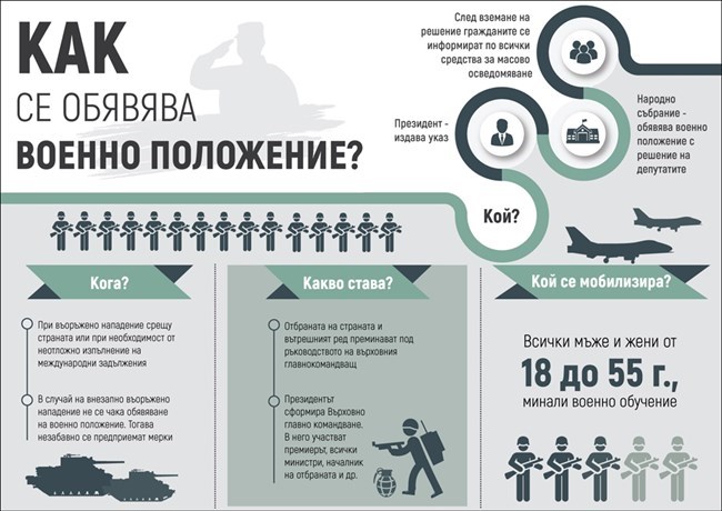 Обявяването на военно положение е уредено в Закона за отбрана и въоръжените сили на Република България. Това става с указ на президента или с решение на депутатите от Народното събрание. Гражданите се информират по всички средства за масово осведомяване.