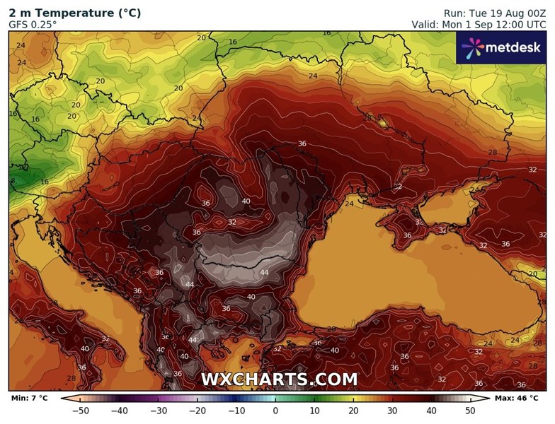 Необичайна прогноза за екстремни температури през първия ден на септември вълнува метеорологичните среди. Глобалният модел GFS показва възможност за рекордна жега на Балканите и в България с температури, достигащи до 42 градуса по Целзий.