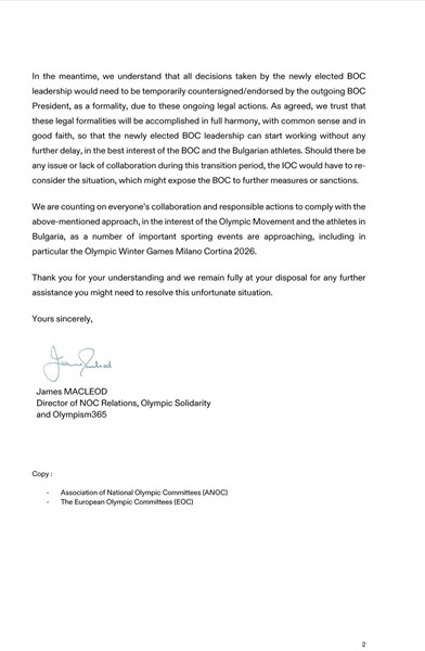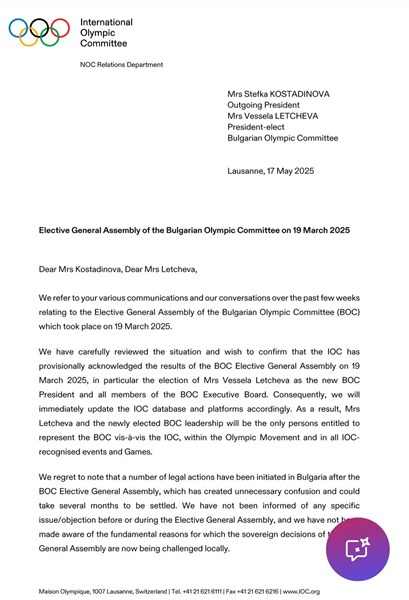 Информацията е публикувана в официално прессъобщение от БОК, разпространено днес. От спортната организация подчертават, че писмото е получено в 11:03 часа българско време и незабавно е направено публично достояние с цел „максимална прозрачност пред медиите, федерациите, спортистите и широката общественост."
