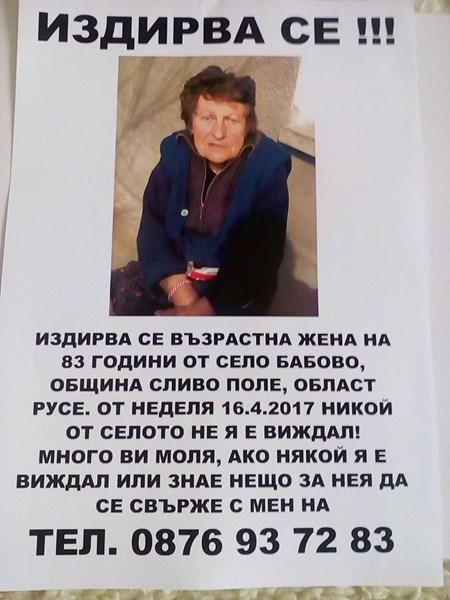 Възрастната жена е на 83 години, от село Бабово, община Сливо поле, област Русе. Няма деменция, в отлично психическо здраве, занимавала се е с пчеларство.