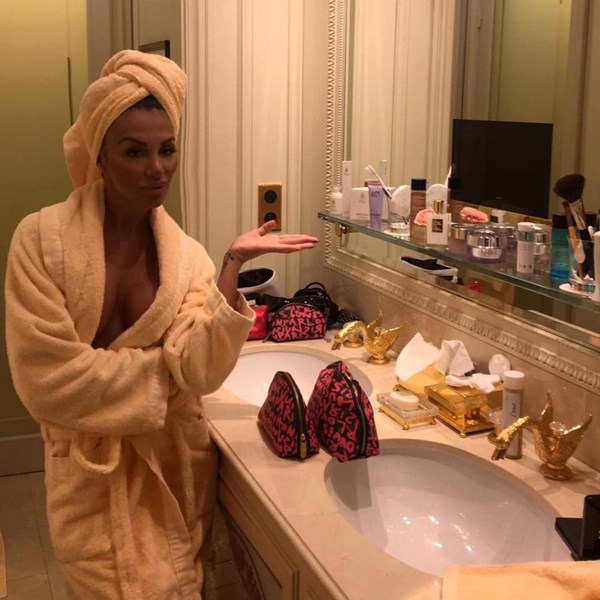 Знойната красавица е споделила снимка в баня, която е толкова обработена с фотошоп около лицето й, че чак стената е изкривена.